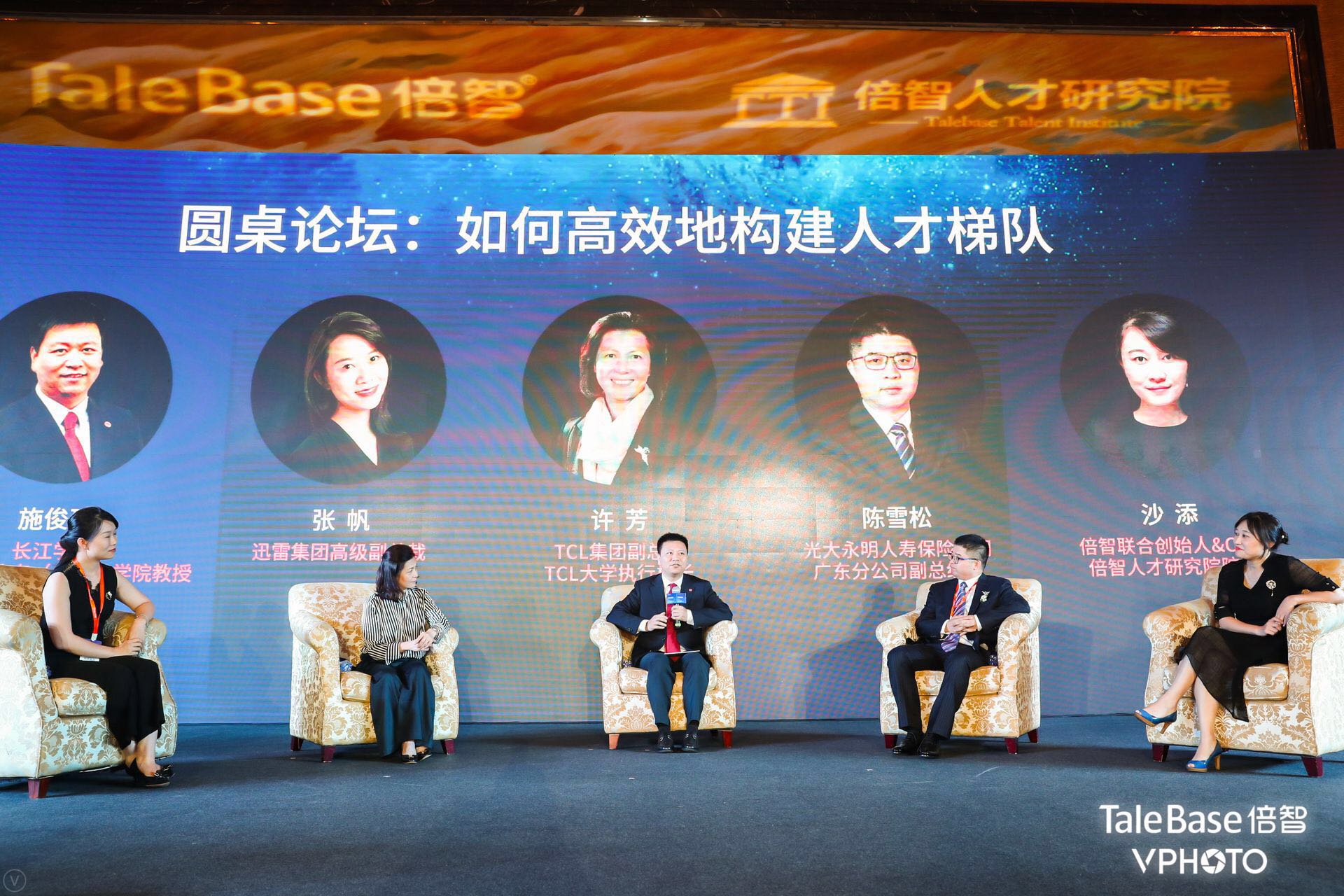 在8月16日举行的第二届国际人才供应链管理高峰论坛上,长江学者、中山大学岭南(大学)学院教授施俊琦先生担任圆桌论坛主持,迅雷集团高级副总裁张帆女士,TCL集团副总裁、TCL大学执行校长许芳女士,光大永明人寿广东分公司副总经理陈雪松先生,倍智人才研究院院长沙添女士出席圆桌论坛,共同探讨企业如何高效地构建人才梯队。