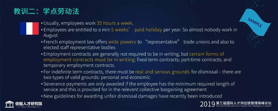 据Cindy提到,TCL在国际化收购并购过程中,因为不熟悉法国劳动法而产生的成本就达到了1亿美金以上。关于中西方劳动法的差异,Cindy也举了一些简单的例子。