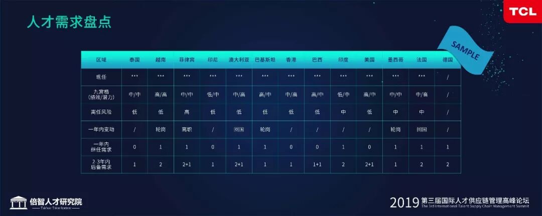 ,盘点不仅仅是盘人才,一定要盘到组织!通过盘点岗位和组织能力的需求,输出一张盘点结果图表。我们到底在哪些国家、哪些岗位需要多少人,在它的后备岗位上需要多少人,这些人从内部找还是外部招,就已经一目了然。