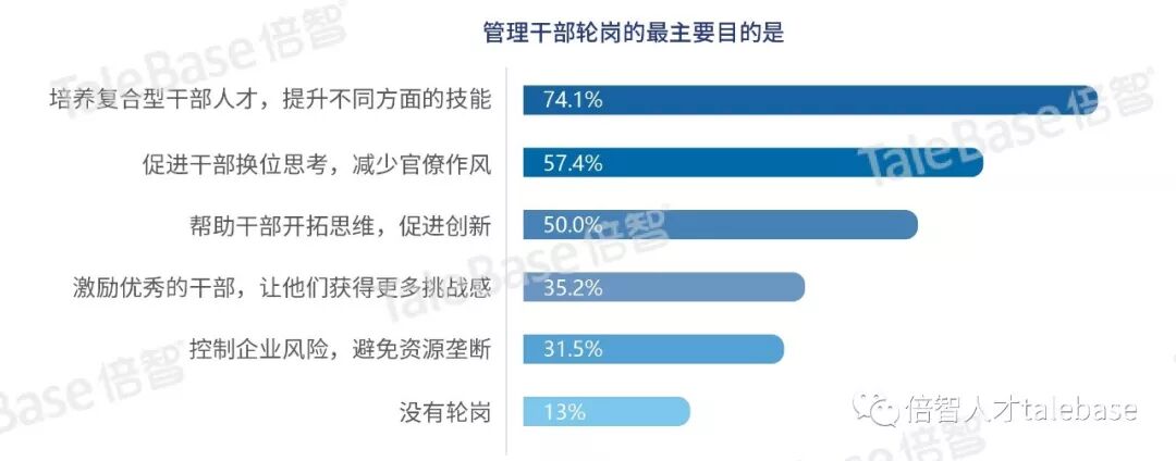 企业最常用的培养方式也是最传统的培养方式——培训课程(79.6%)。其次是轮岗,有63.0%,企业让干部进行轮岗的最主要目的是培养复合型干部人才,帮助他们提升不同方面的技能(74.1%),希望促进干部换位思考,减少官僚作风(57.4%),同时开拓思维,促进创新(50.0%)。