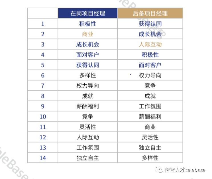 积极性、商业、成长机会、面对客户和获得认同;后备项目经理最看重的五个驱动因素是: