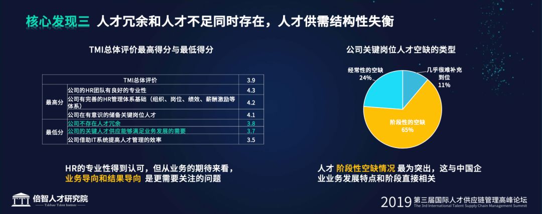 虽然普遍来说,公司管理层都比较重视企业的人才管理,并且企业内部也有相对完善的人力资源管理体系基础。但是,人才冗余和供应不足,这两项行为在中国企业TMI™总体评价中处于低分项位置。这也是值得人力资源从业者深思的问题。