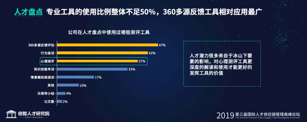人才盘点实施过程中的专业性水平有待提高。首先,大部分企业在人才盘点实施过程中没有使用专业的工具。调研了企业对各类测评工具的使用情况,使用得最多的360多源反馈评估也没有超过半数,具体而言在人才盘点实施过程中,一半以上的企业没有使用360多源反馈评估,以及58%没有使用行为面试,63%没有使用心理测评,企业很多时候以经验判断为主,缺乏结构化的人才评价和科学的评价工具,会影响人才盘点中评价结果的可信度。