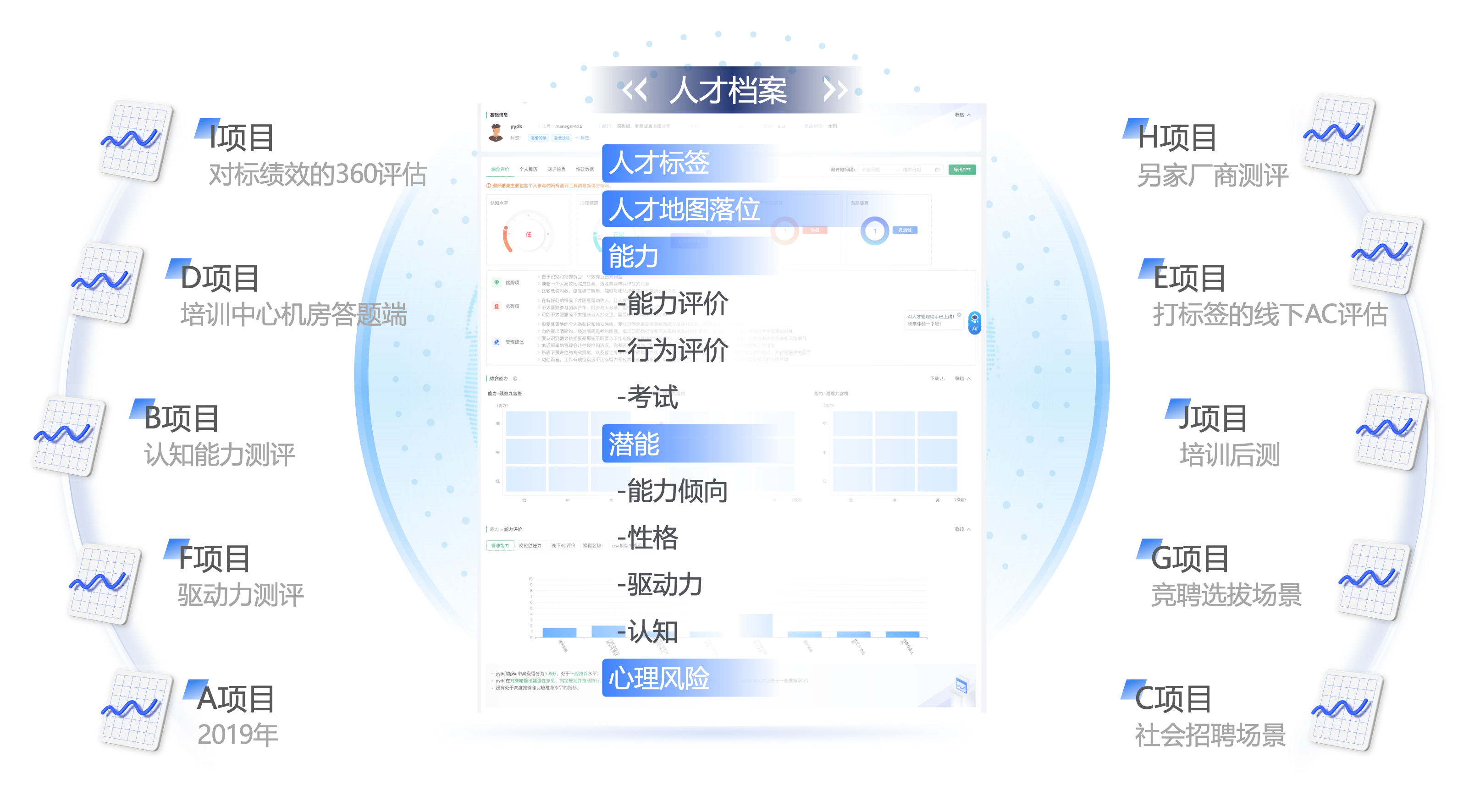 在过去我们做测评项目,常常每个项目分别有不同的答题端口、项目管理者和答题对象,导致数据分散且难以整合利用。传统做法下,人才数据散落在不同时间、不同空间,不同场景和不同工具里。这些数据固化在一份份报告中,往往使用一次后便不再留存或利用,导致数据无流通、无整合、无沉淀。