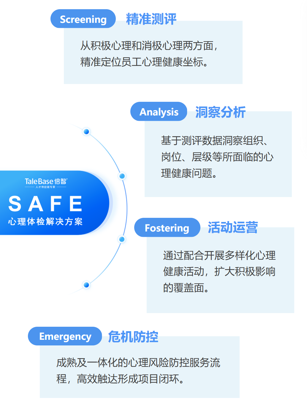 通过构建 “精准测评 + 洞察分析 + 活动运营 + 危机防控” 四位一体服务体系,倍智 S·A·F·E 心理体检解决方案为企业提供了全面周到的心理健康支持:既能及时筛查并干预员工心理风险、提升员工心理状态,也能助力企业打造健康组织文化,保障组织稳健发展。