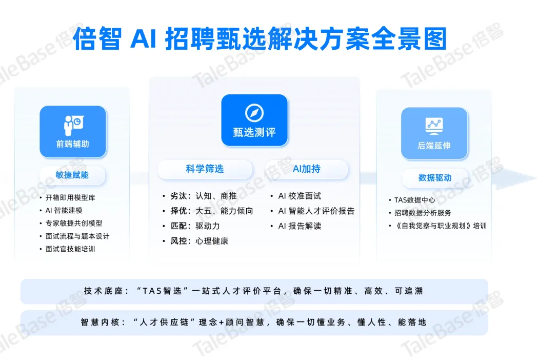 这些深厚的专业积淀,最终系统化地呈现并落地于一个完整的框架设计之中——倍智AI招聘甄选解决方案全景图清晰地揭示了,我们如何将技术、数据与人才管理智慧深度融合,构建“科学选人”的落地方案。