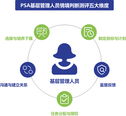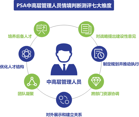 PSA(Proble Soving Assessment)管理人员情境判断测评——是以情境判断测验技术为基础,通过创设管理中常见的挑战情境,被测者针对情境判断每一种应对方式进行有效性评价,以在线评估的方式考察管理人员对关键挑战的应对方式的认知,综合考察管理人员的素质水平。